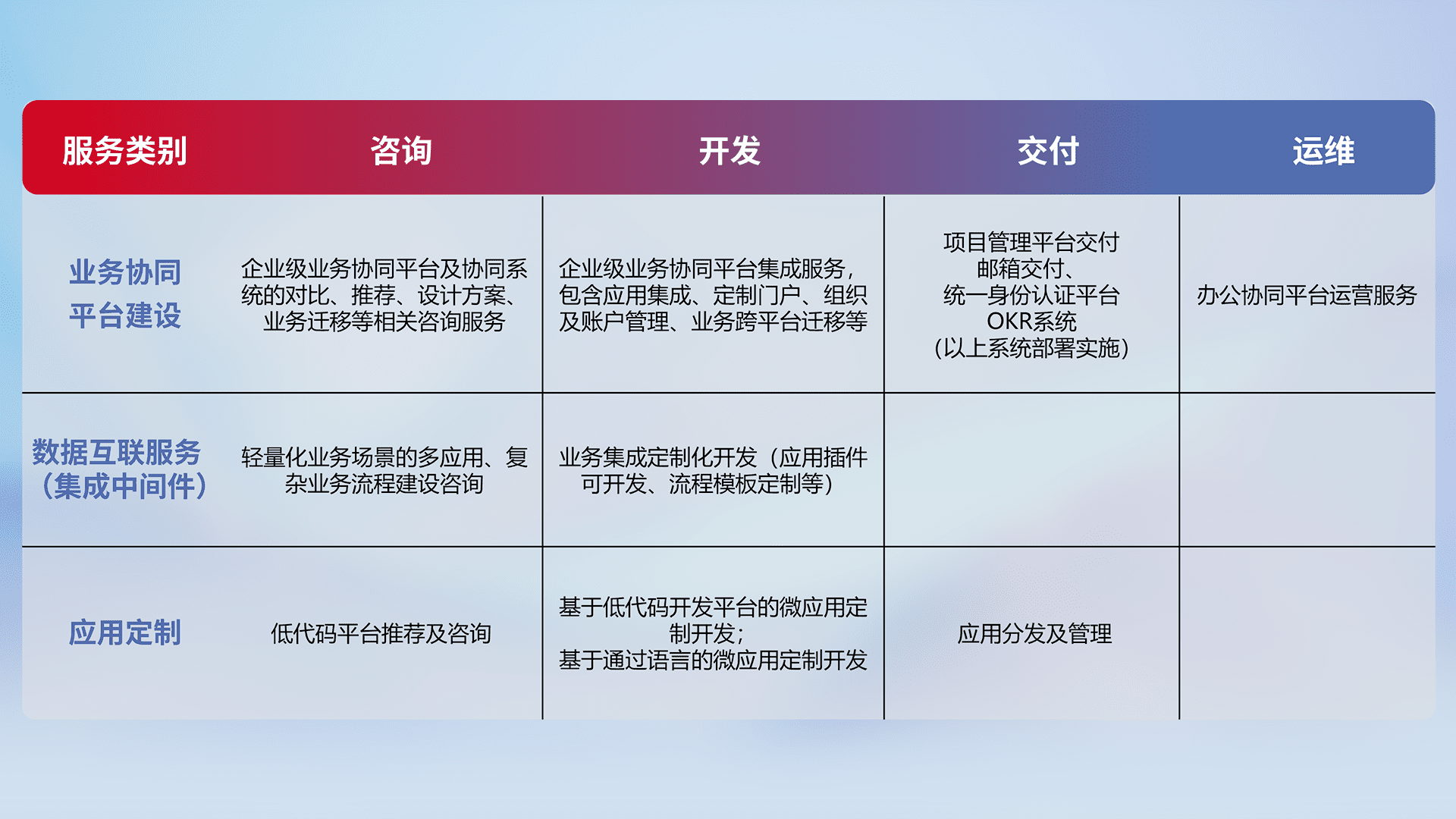 针对钉钉、、、企微、、IDaas等平台级产品提供产品的规划、、、方案、、、交付、、、、定制化开发等服务,,,,实现如统一协同办公、、智能客户服务、、、、混合会议管理、、、智能数据查询、、、等业务场景,,实现数字化转型。。。